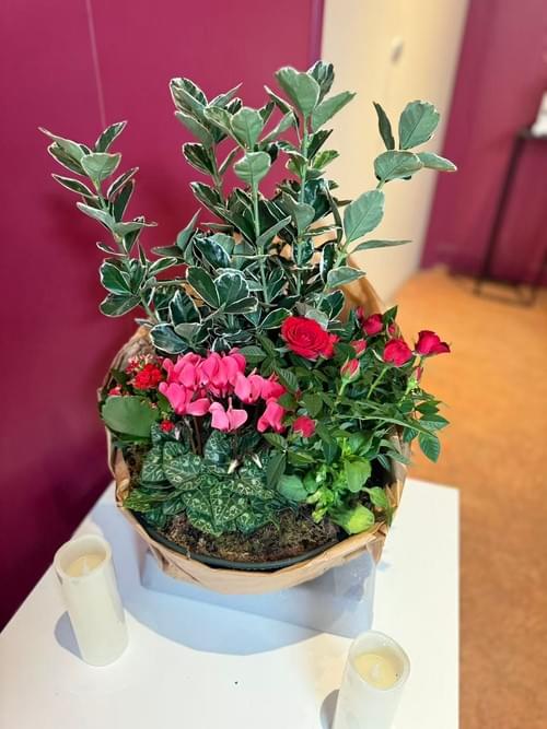Fleurs principales : Rosier et plantes non gélives. Couleurs principales : Rouge. Chaque coupe de plante est unique, votre fleuriste peut être amené à substituer une variété de fleur pour réaliser sa création et vous offrir la plus belle des compositions.