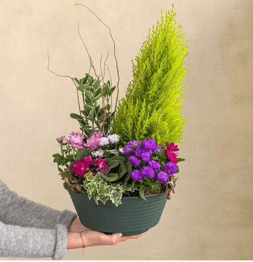 Fleurs principales : Conifère et plantes fleuries de saison. Couleurs principales : Rose, parme et violet. Chaque coupe de plante est unique, votre fleuriste peut être amené à substituer une variété de fleur pour réaliser sa création et vous offrir la plus belle des compositions.