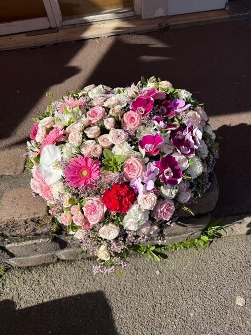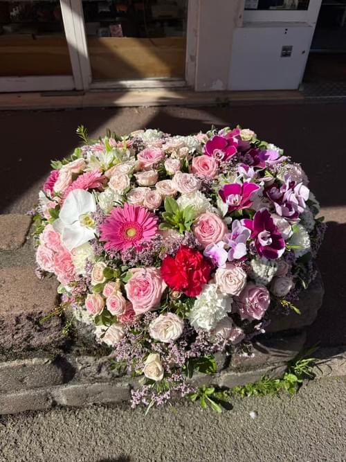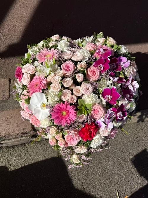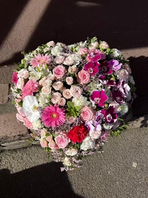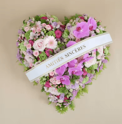 Coeur funéraire. Il est des variétés de fleurs dont la puissante signification nous touche en plein cœur. Dans le cadre d’un deuil et d’une cérémonie d’adieu, pour honorer la mémoire de la personne disparue, pensez aux Roses et aux Orchidées. Tandis que les premières, particulièrement dans des teintes claires, évoquent la sympathie et l’estime éprouvées pour le défunt, les Orchidées sont aussi riches en symboles. Elles incarnent la douceur et l’attachement. Aussi, comment mieux les mettre en scène qu’à travers cette composition florale en forme de cœur ?