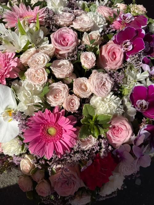 Fleurs principales : Rose et phalaenopsis. Couleurs principales : Rose et vert . Chaque composition est unique, votre fleuriste peut être amené à substituer une variété de fleur pour réaliser sa création.
