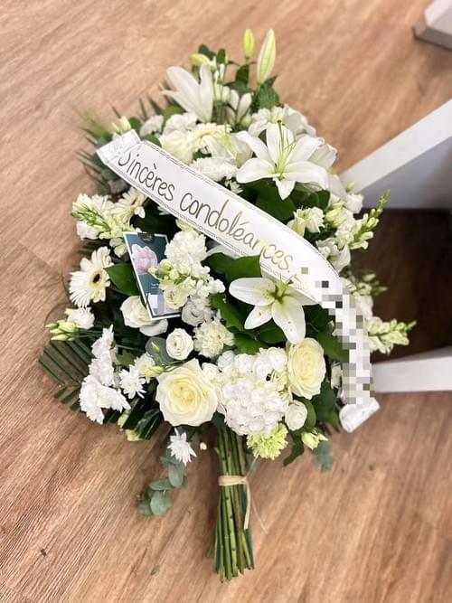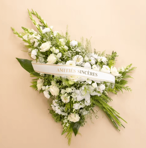 Gerbe de fleurs. Les gerbes sont plébiscitées durant les cérémonies d’hommage aux défunts. Voyage astral blanc est donc conçu, avec le plus grand soin et la plus grande déférence, par le fleuriste artisan le plus proche de chez vous. Se composant de mufliers, de lys ou encore de roses aux délicates nuances de blanc, Voyage Astral blanc sera la marque de votre respect et de votre attachement les plus respectueux et les plus nobles. Associé aux lys et aux roses, fréquemment utilisés lors d'obsèques, le muflier symbolise la fidélité.